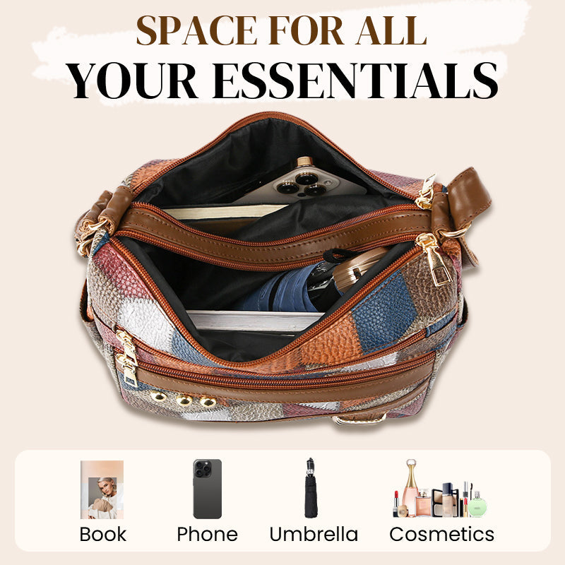 đVintage-laukku, jossa on geometrinen kuvio ja sÀÀdettĂ€vĂ€ hihna