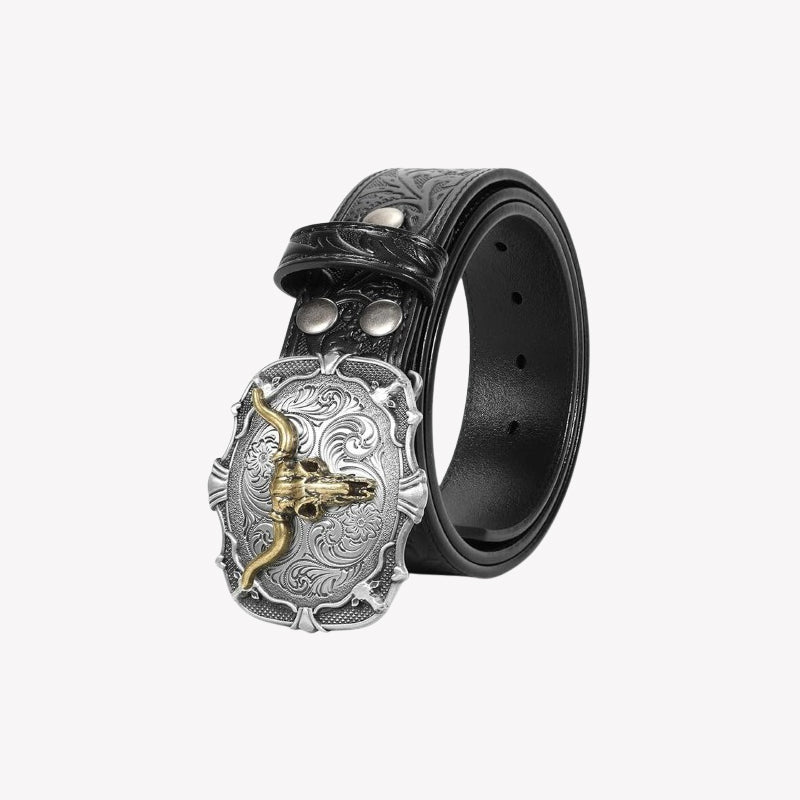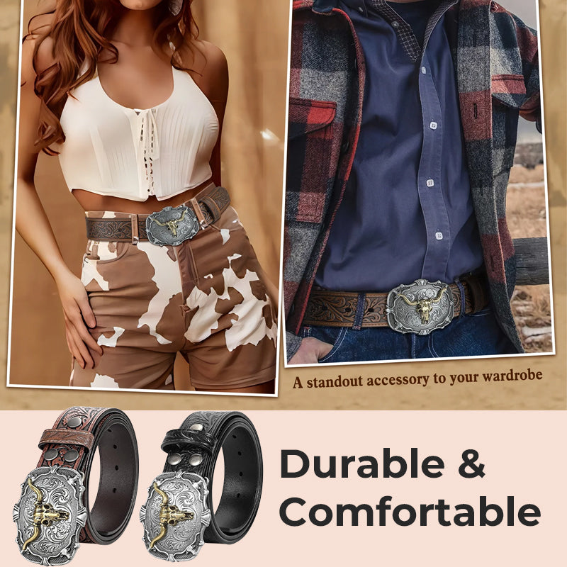 Unique Metal Relief Buckle: Decorated with a golden bull horn design 🐂, representing power and bravery.